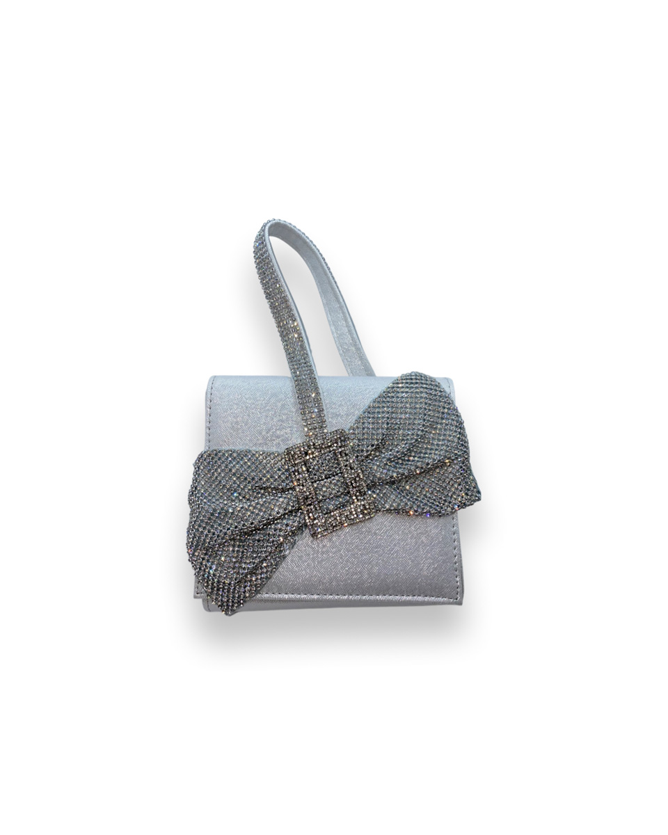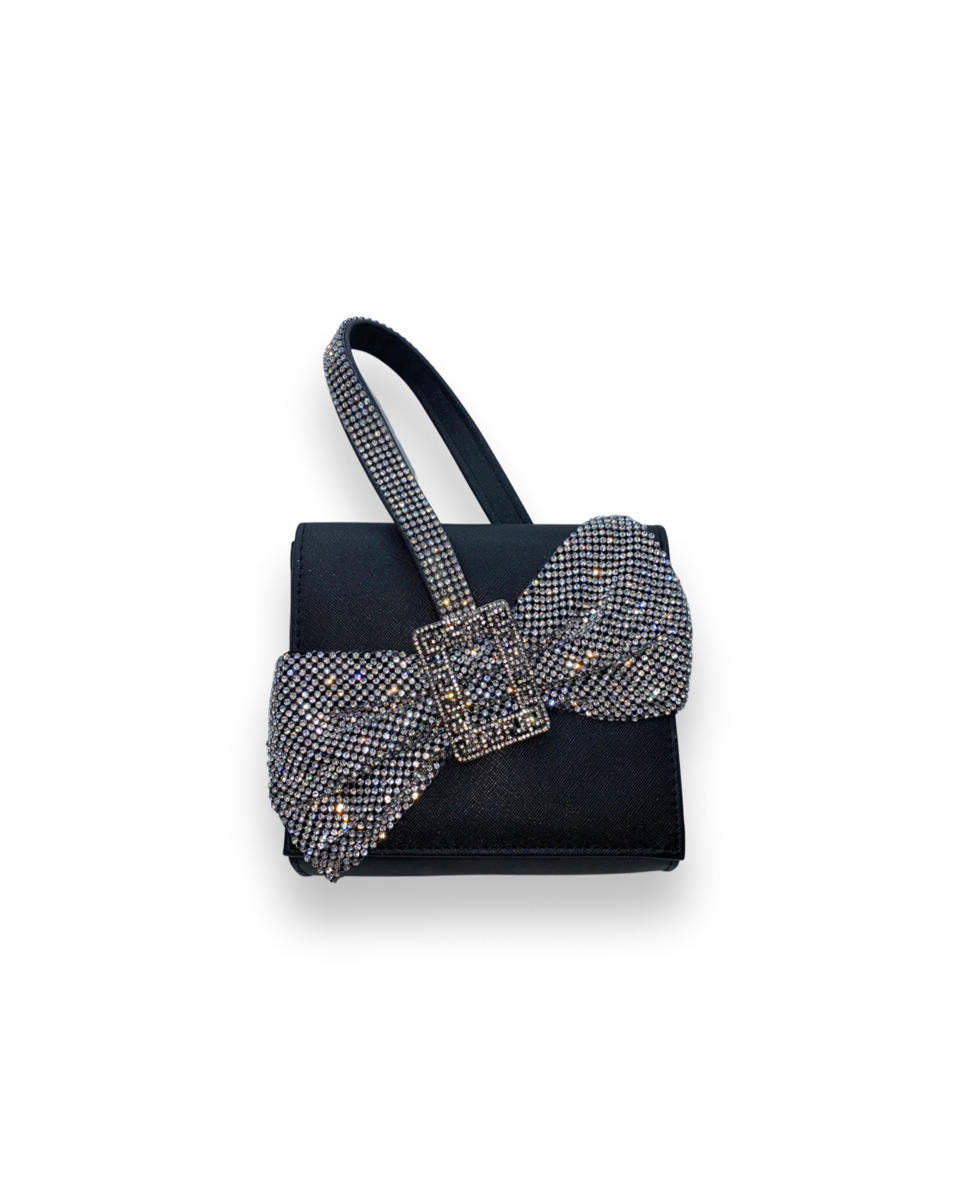 Crystal bow looking evening cluth with a flap closure with a two spacious compartment and metal chain